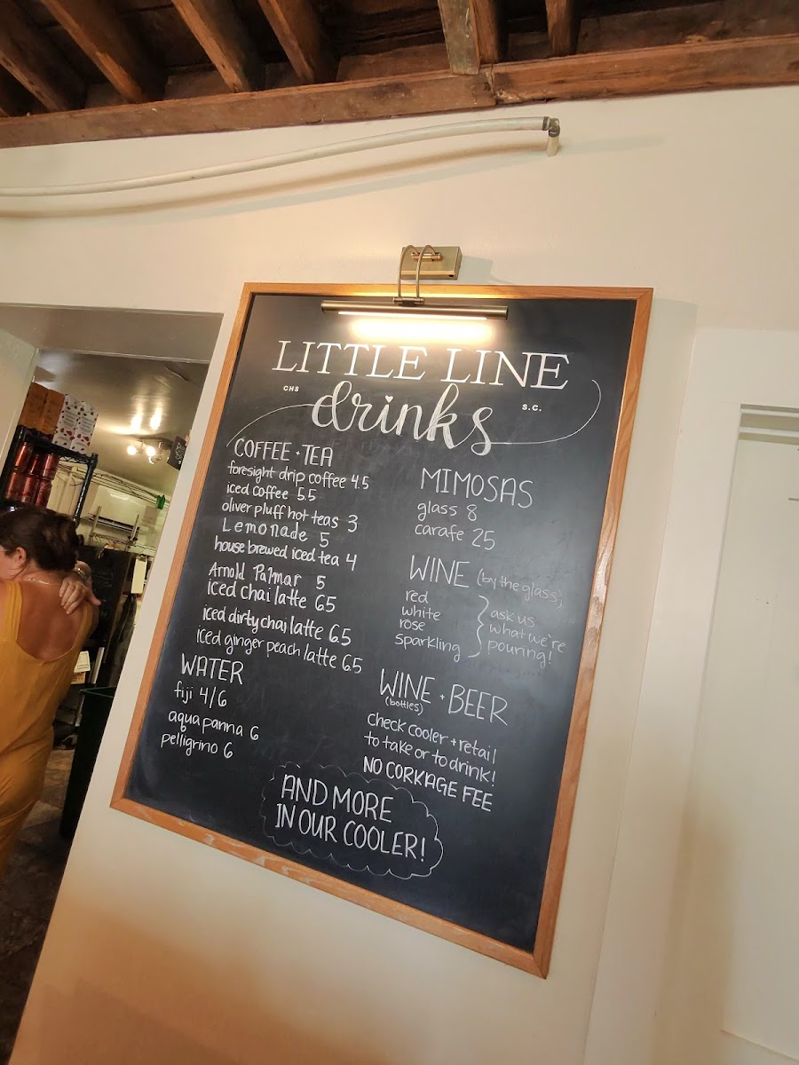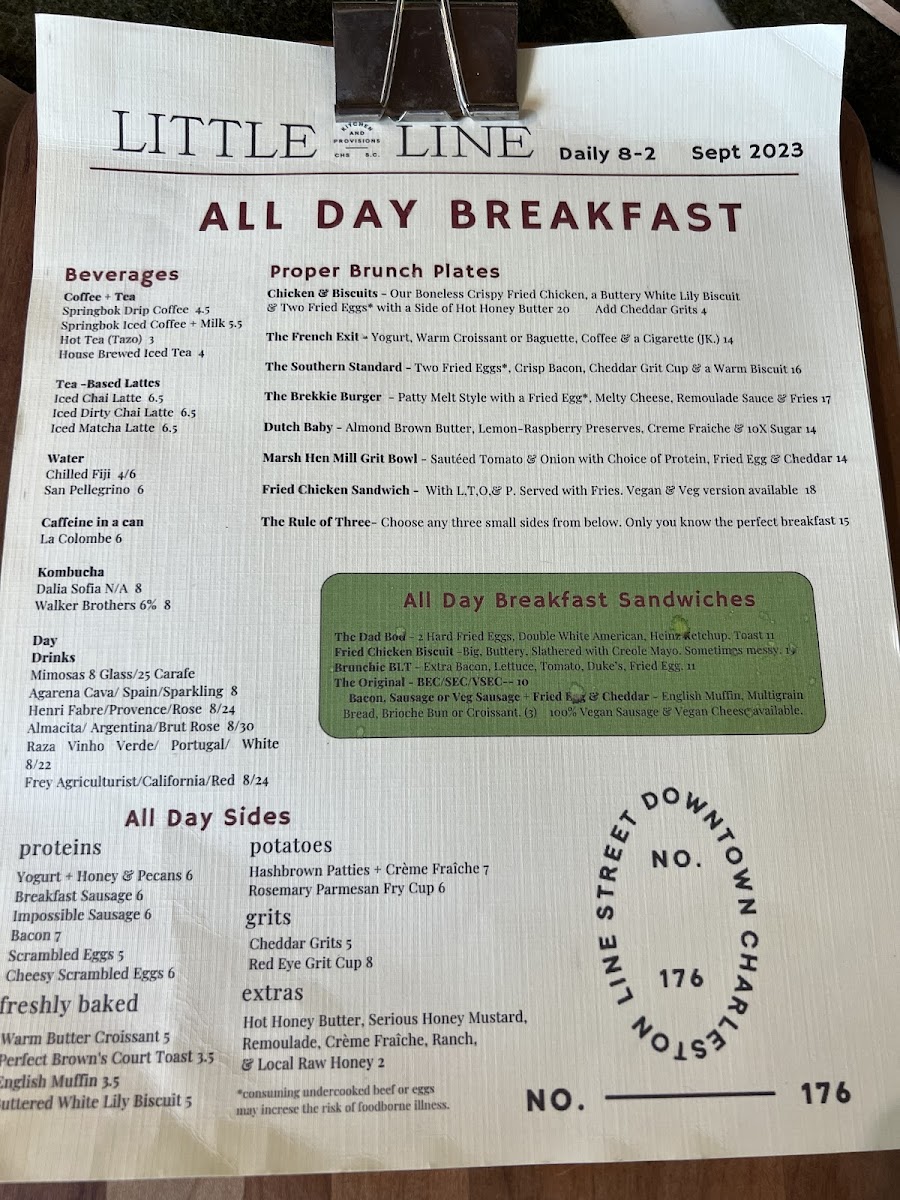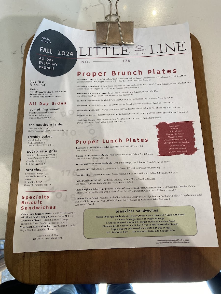 The Original Brunch Plate of Little Line. Two Fried Farm Eggs, Crispy Applewood Smoked Bacon, Cheddar Grits and a Warm Buttermilk Biscuit with Butter & Preserves.